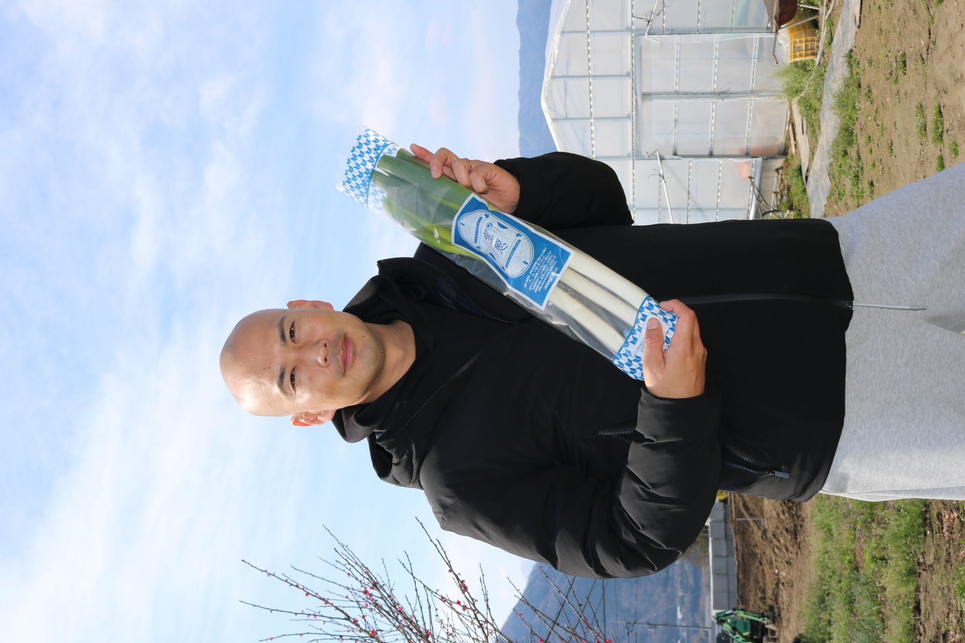 白ネギを手に藤原さん。「農業を通じて『うまさ』の感動を届けたい」(写真左)